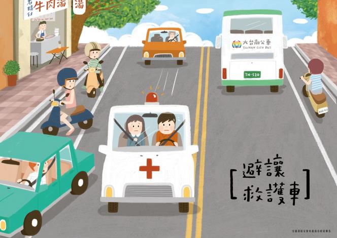 避讓救護車,救人救災最優先,請禮讓消防車、救護車、警備車、工程救險車
