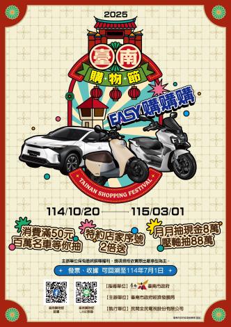 2025臺南購物節 活動期間自114年10月20日至115年3月1日止(消費憑證發票、收據追溯至114年7月1日起),消費者在本市店家消費,登錄活動官網或購物節官方LINE,累計滿50元就有機會獲得現金、百萬名車等多項好禮。 2025臺南購物節官網及活動相關文宣雲端連結:如附