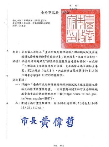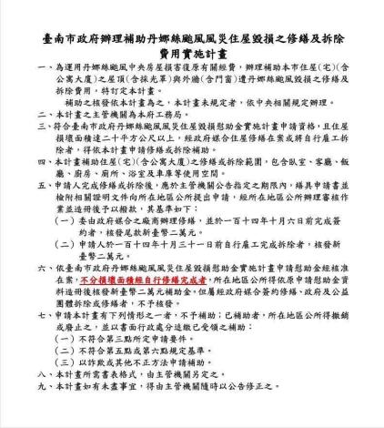 * 可申請對象一、符合「家園復原慰助金」核定資格之災戶(不分屋損面積)二、已自行修繕完成即可申請* 排除對象一、曾由政府媒合簽約修繕者二、曾由政府或公益團體協助拆除或修繕者*受理期限至114年12月31日止